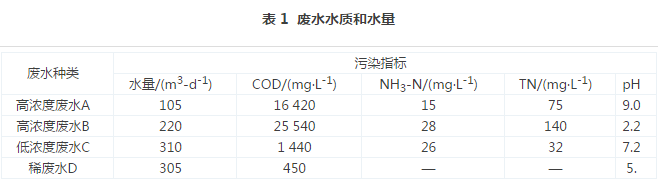 河北省某化工企業(yè)主要生產(chǎn)有機顏料,廢水來源主要是工藝廢水、廢氣吸收廢水、地面沖洗水、生活污水等。廢水按水質(zhì)可以分為4大類:第1類為高濃度廢水A(COD高、鹽分低),主要來源于精制廢水、濾洗廢水、粗品車間廢水,主要污染物為COD、苯系物等;第2類為高濃度廢水B(COD高、鹽分高),主要來源于結(jié)晶過濾廢水、濾洗廢水、精餾塔頂流出液、廢氣吸收廢水、粗品車間廢水、母液,主要污染物為COD、苯系物、二氯乙烷、二甲基甲酰胺、水合肼、鹽分等;第3類為低濃度廢水C,主要來源于消化廢水、水沖泵廢水、地面沖洗廢水、蒸餾放料槽廢水、蒸汽尾水、生活污水,主要污染物為COD、SS、氨氮、總磷、苯系物等;第4類為稀廢水D,主要來源于產(chǎn)品洗水,主要污染物為COD、SS等。根據(jù)廢水水質(zhì)不同先分質(zhì)處理,再合并處理。最終處理出水執(zhí)行《污水排入城鎮(zhèn)下水道水質(zhì)標(biāo)準(zhǔn)》(CJ 343—2010)的B等級標(biāo)準(zhǔn)。各類廢水水質(zhì)水量如表 1所示。