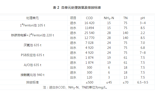 電費:電價0.7元/(kW˙h),電費成本2.82元/m3。人工費:3人,平均每人3 000元/月,人工成本0.32元/m3。藥劑費:聚丙烯酰胺消耗量0.1 kg/m3,聚丙烯酰胺成本0.86元/m3;雙氧水消耗量10 kg/m3,雙氧水成本3.10元/m3;硫酸亞鐵消耗量1 kg/m3,硫酸亞鐵成本0.17元/m3;硫酸消耗量1 kg/m3,硫酸成本0.17元/m3;鐵碳微電解填料消耗量0.4 kg/m3,填料成本1.17元/m3;液堿消耗量7 kg/m3,液堿成本1.94元/m3;復(fù)配劑消耗量0.5 kg/m3,復(fù)配劑成本3.5元/m3;營養(yǎng)劑成本0.8元/m3;PSB系統(tǒng)光合細(xì)菌培養(yǎng)成本0.3元/m3;自來水成本0.13元/m3。綜合電費、人工費、藥劑費,總運行成本15.28元/m3。