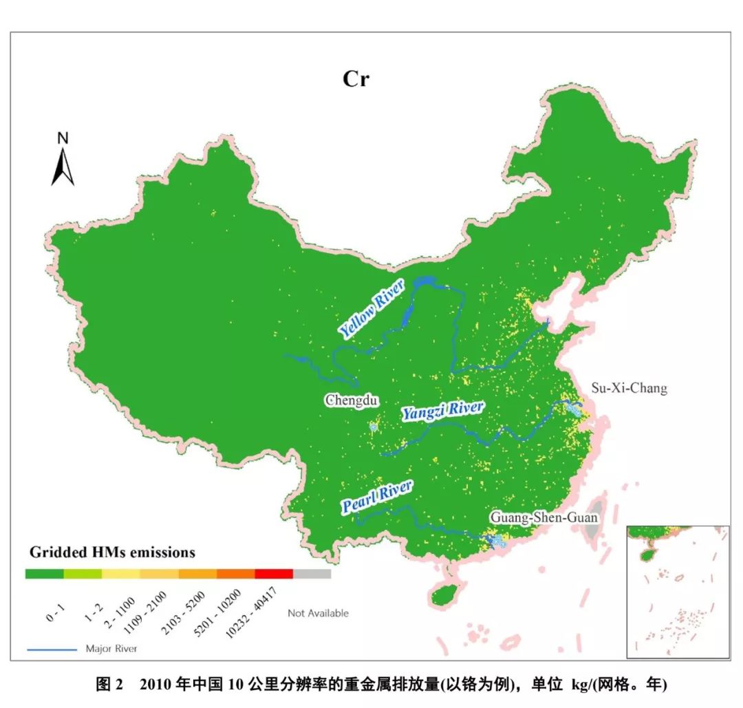 為進(jìn)一步探討重金屬排放的空間特征,本文將城市層面的排放量進(jìn)行高分辨率空間量化。如圖2所示,以鉻為例,由于在工業(yè)結(jié)構(gòu)、發(fā)展程度和污染源分布上的巨大差異,中國鉻排放的地域分布極不均勻。研究發(fā)現(xiàn),按照網(wǎng)格排放量大小進(jìn)行排序,鉻排放量占比超1%的8個(gè)網(wǎng)格集中于廣東、江蘇、河北和山東,其排放量占比達(dá)到15%,通過鉻的排放量分布圖可以看出,鉻的排放具有較為明顯的沿海分布特征。