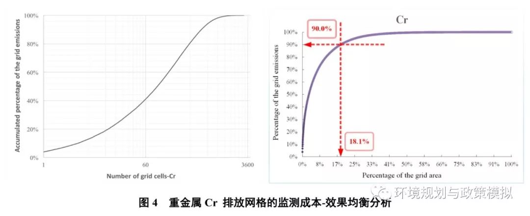 從污染監(jiān)控的經(jīng)濟(jì)學(xué)角度來說,對排放網(wǎng)格進(jìn)行監(jiān)測并不都是高效的,當(dāng)監(jiān)測效果增長快于監(jiān)測成本增加時(shí),對此排放網(wǎng)格進(jìn)行監(jiān)測是經(jīng)濟(jì)高效的。以鉻為例,經(jīng)監(jiān)測成本-效果評估后監(jiān)測高效網(wǎng)格的排放總量占比約90%左右。