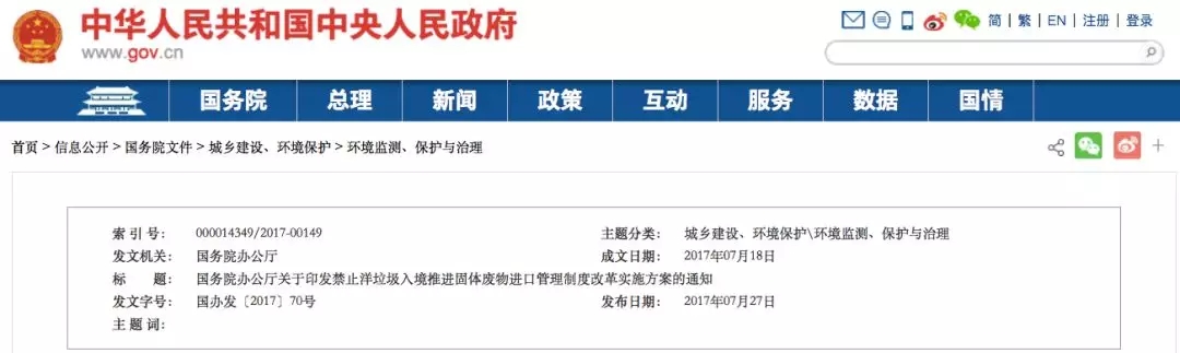 去年7月18日,國務(wù)院辦公廳發(fā)布《關(guān)于印發(fā)禁止洋垃圾入境 推進固體廢物進口管理制度改革實施方案的通知》,通知稱: