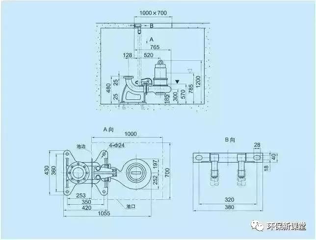 潛水泵耦合式安裝時,平面的開孔需考慮潛水泵的最小安裝尺寸。案例中A向視圖表示了水泵的最小安裝孔的大小尺寸,1000×700mm。