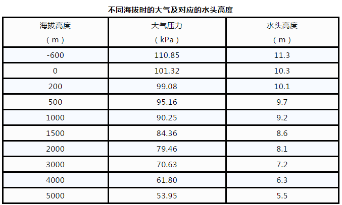 不同海拔時的大氣及對應(yīng)的水頭高度見下表: