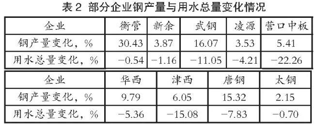 2017年有22家企業(yè)鋼產(chǎn)量增長(zhǎng),但用水總量下降,這是企業(yè)用水和節(jié)水工作取得的好成績(jī),部分企業(yè)情況見(jiàn)表2。