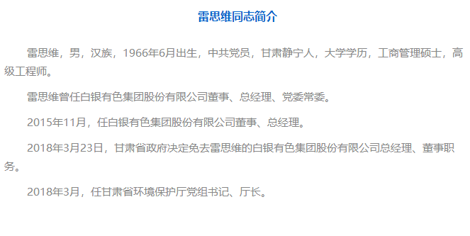 3月28日,甘肅省十三屆人大常委會第二次會議通過了省人民代表大會常務(wù)委員會決定任免名單,決定任命雷思維為甘肅省環(huán)境保護廳廳長。