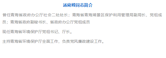 3月30日,青海省第十三屆人民代表大會常務(wù)委員會第二次會議通過,決定任命:湯宛峰為青海省環(huán)境保護廳廳長。
