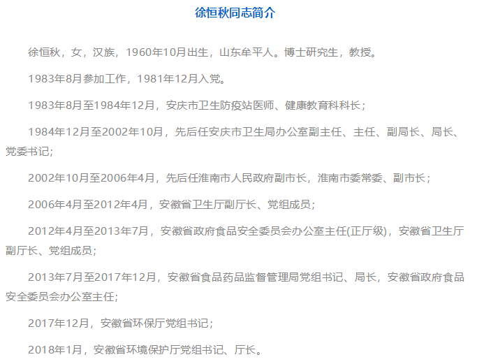 1月17日下午,安徽省第十二屆人民代表大會常務(wù)委員會第四十三次會議決定,任命徐恒秋為安徽省環(huán)境保護廳廳長。