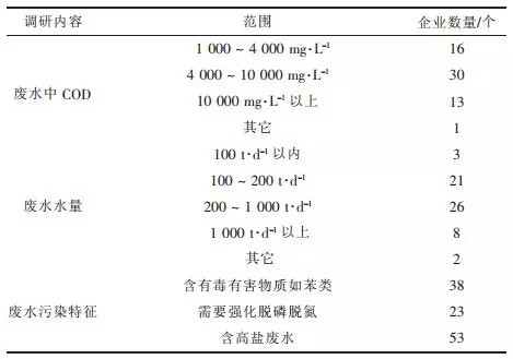 本次調研主要內容和結果見表1。調研情況表明,企業(yè)普遍存在排污量大,企業(yè)廢水排放量在200~1000t/d之間的企業(yè)數(shù)占調查總數(shù)的43%,其中有8家企業(yè)排污量超過1000t/d?;て髽I(yè)不僅排污量大,污染物濃度也普遍較高。處理前COD質量濃度在1000~2000mg/L的企業(yè)占比為27%,大約有50%的企業(yè)的污水COD質量濃度在4000~8000mg/L,此外還有22%的企業(yè)污水COD質量濃度超過10000mg/L,進水COD濃度高給污染治理帶來很大難度。