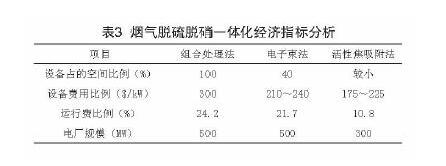 現(xiàn)在已經(jīng)付諸商業(yè)應(yīng)用的且能夠滿足嚴格的排放要求的煙氣脫硫、脫硝一體化工藝主要有電子束法和活性焦法。表3是這2種方法以及石灰石一石膏濕法脫硫+SCR脫硝(簡稱組合法)的主要經(jīng)濟技術(shù)指標(biāo)的分析結(jié)果對比。