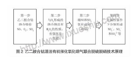 目前研究較多的催化劑為Fe、Mn等過渡金屬離子和乙二胺合鈷等有機物。以乙二胺合鈷為例說明濕法有機催化氧化煙氣聯(lián)合脫硫脫硝技術(shù)原理,如圖2所示。