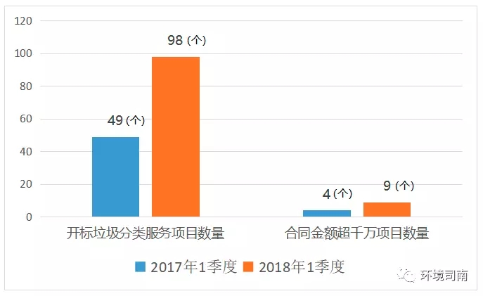 強(qiáng)制垃圾分類試點(diǎn)、農(nóng)村垃圾治理、農(nóng)村人居環(huán)境整治三年行動等相關(guān)政策的陸續(xù)出臺和持續(xù)推進(jìn),農(nóng)村垃圾治理、垃圾分類等非傳統(tǒng)環(huán)衛(wèi)項(xiàng)目不斷涌現(xiàn)。2018年1季度與去年同期相比,垃圾分類和農(nóng)村垃圾治理的項(xiàng)目數(shù)量和中標(biāo)金額均出現(xiàn)倍增。