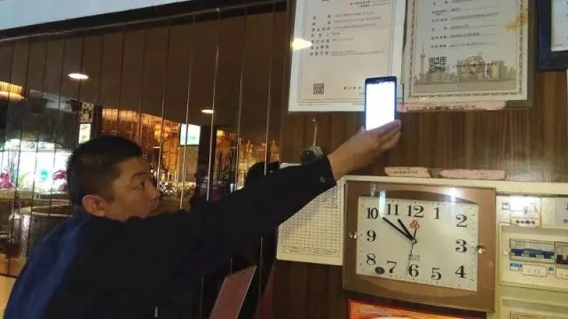 ③ 收運員要打開手機內(nèi)的專用軟件,掃描收運對象店堂內(nèi)的二維碼,記入具體信息,才能去下一站,以防中間環(huán)節(jié)有人“玩貓膩”——一些沒有被記錄的“地溝油”偷偷進(jìn)入了非正規(guī)環(huán)節(jié)。