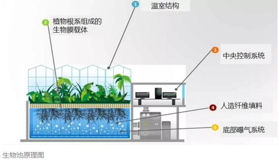 在生物池溫室內(nèi)的植物須選擇根系發(fā)達的水生植物,根系對顆粒態(tài)氮、磷的吸附、截留和促進沉降等作用。漂浮植物發(fā)達的根系與水體接觸面積很大,能形成一道密集的過濾層。當(dāng)水流經(jīng)過時,不溶性膠體會被根系吸附或截留。與此同時,粘附于根系的細菌在進入內(nèi)源呼吸階段后會發(fā)生凝聚,把懸浮性的有機物和新陳代謝產(chǎn)物沉降下來。