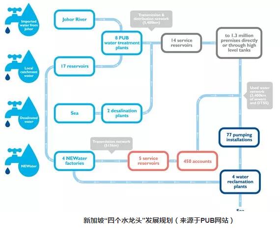 也在同一年,受到NEWater示范項目成功的鼓舞,PUB提出重新制定新加坡的供水水質(zhì)規(guī)劃——“四個國家水龍頭”計劃,計劃到2060年,即與馬拉西亞供水協(xié)議到期前一年,新加坡將完全實現(xiàn)水資源的自給自足,在新加坡的總?cè)丝谝堰_到目前的3倍的前提下,海水淡化和NEWater能夠滿足水資源需求量的80%,其中NEWater占55%。