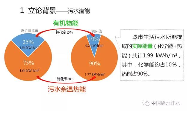 今天我的發(fā)言既與碳中和有關(guān)也跟磷回收有關(guān)。那么,關(guān)于碳中和談得是污水處理的耗能過程,有機物及氮磷去除要消耗能量,碳中和即需要從污水處理廠或污水里找到能量去彌補能耗。對此,大家更多會想到剩余污泥里有大量含能有機物,這也是我們搞污水處理人所關(guān)注的,所以,污泥厭氧消化從傳統(tǒng)到現(xiàn)在,以至于有更多的人前赴后繼對厭氧消化進行優(yōu)化提高其能量轉(zhuǎn)化效率,包括前處理,比如說,高碑店現(xiàn)在的熱水解,就是希望最大化把污泥中的有機能源轉(zhuǎn)化出來。但是,我們搞污水處理的人忽視了一個問題,就是說除了有機物形成的化學(xué)能以外,還有大量污水中的余溫熱能。請大家看這個圖,有機物中的化學(xué)能與污水中余溫熱能相比,很少、很少。理論上一個75%,一個25%。也就是說污泥中有機物的化學(xué)能只占整個污水中潛能的25%,75%是熱能。我們給大家先看這樣一個概念,也就是說我們所關(guān)注的厭氧消化轉(zhuǎn)化的能源占整個污水中的潛能,理論值是25%。那么這25%的有機能源又能轉(zhuǎn)化多少呢?顯然這是個理論值,不可能100%轉(zhuǎn)化。