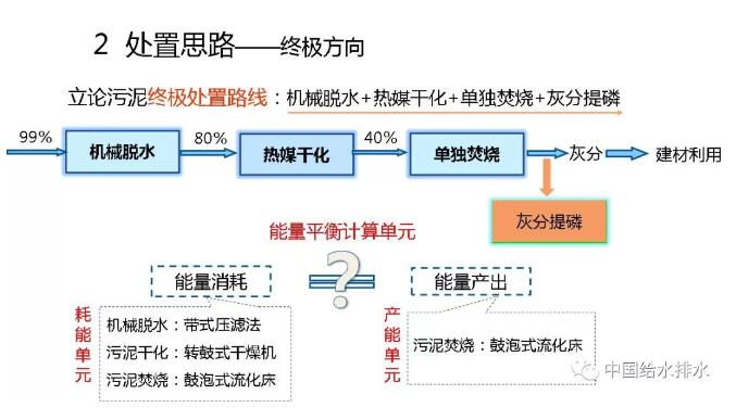 因此,最后只有去“燒”!但是,“燒”必須要經(jīng)過機械脫水,含水率99%的污泥首先降至80%;然后,再熱干化到40%以下。到40%就可以自持燃燒了。燒,但污泥焚燒千萬不能放在水泥窯中同水泥一塊燒。這樣不對。會把磷就全部固定在水泥里,磷再也不能回用了!所以,要單獨燒。最多可以跟有機垃圾一塊燒。燒完以后,大量的磷都在灰分里面,需要提取。當然了,大家知道,脫水、熱干化、單獨焚燒都是要輸入能量的,當焚燒之后也會產(chǎn)生能量。現(xiàn)在我們有一個問題,就是輸入能量和產(chǎn)生的能量能否達到平衡?我們需要計算一下,如果能打個平手那就是很了不起的事了。