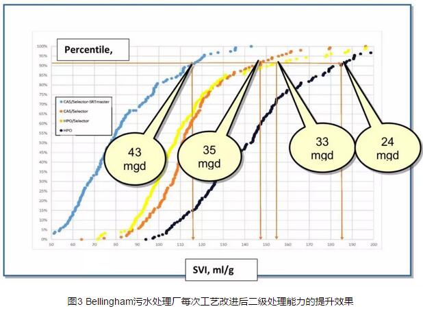 Bellingham污水處理廠最初的設(shè)計(jì)是采用純氧曝氣工藝,幾十年來(lái)一直受到絲狀菌污泥膨脹問(wèn)題的困擾,其由低溶氧引起,常出現(xiàn)于SRT較低的環(huán)境。十年前該污水廠開(kāi)始采用厭氧生物選擇器,之后SVI得到改善,但仍能觀察到SVI偶有上升。近來(lái)該污水廠轉(zhuǎn)為采用傳統(tǒng)活性污泥處理系統(tǒng),盡管獲益頗多,但未能解決SVI偶發(fā)上升的問(wèn)題。在安裝SRT自動(dòng)控制系統(tǒng)后,SVI的穩(wěn)定性得到顯著提升。圖3為每次升級(jí)改造后二級(jí)處理工藝的處理能力得到的提升。由圖可知,在安裝SRT自動(dòng)控制系統(tǒng)后,該污水廠的二級(jí)處理能力提升了25%。