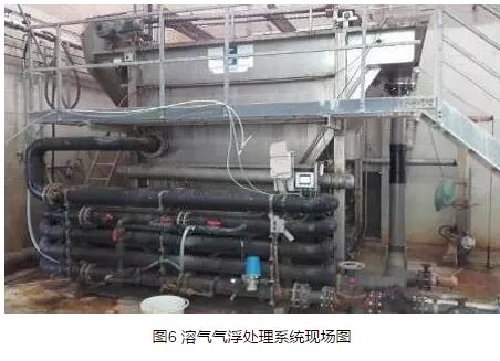 通過(guò)實(shí)時(shí)監(jiān)測(cè)進(jìn)水的COD負(fù)荷,不僅可以優(yōu)化每個(gè)生產(chǎn)日不同階段的藥劑投加量,還可以計(jì)算出DAF系統(tǒng)的氣固比(A/S,air to solids ratio),以確定所需的曝氣量或氣壓。通過(guò)特制的TOC分析儀測(cè)定廢水的TOC值,然后根據(jù)經(jīng)過(guò)實(shí)驗(yàn)分析得出的不同產(chǎn)品處理廢水的TOC/COD比值,確定相應(yīng)的COD值,實(shí)現(xiàn)COD負(fù)荷的實(shí)時(shí)監(jiān)測(cè);然后通過(guò)正反饋控制系統(tǒng),即可根據(jù)COD負(fù)荷實(shí)時(shí)優(yōu)化絮凝劑、pH調(diào)節(jié)劑及聚合物的投加量。圖5和圖6分別為i-DOSE系統(tǒng)的組織構(gòu)架以及DAF處理系統(tǒng)的現(xiàn)場(chǎng)圖。