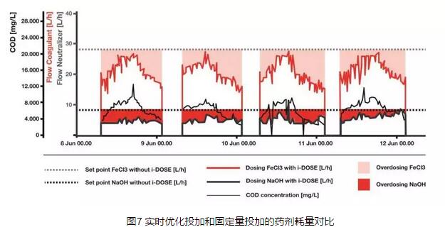 對(duì)于50 m3/h的DAF處理系統(tǒng),應(yīng)用i-DOSE系統(tǒng)之后,氯化鐵的消耗量減少了20%,NaOH的消耗量減少了41%,藥劑消耗總量減少了25%;日常檢查和調(diào)整投入的時(shí)間減少了50%;產(chǎn)生的污泥量減少了3%;年投入成本節(jié)省了約3萬(wàn)歐元。此外,根據(jù)實(shí)時(shí)測(cè)得的COD負(fù)荷可調(diào)整DAF系統(tǒng)的的氣固比,從而可以減少系統(tǒng)22%~27%的能耗。