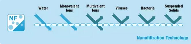 傳統(tǒng)的工業(yè)純水、瓶裝純凈水使用的大多是反滲透技術(shù),而納濾技術(shù)大家一般認(rèn)為它是介于超濾與反滲透之間的一種過濾技術(shù)。但因?yàn)樗谙到y(tǒng)設(shè)計(jì)、操作模式上跟反滲透接近,因此不少人會(huì)認(rèn)為它是一種“疏松”的反滲透。納濾是孔徑尺寸為0.001微米的選擇性膜過濾技術(shù),因?yàn)樗粌H能截留分子量較大的有機(jī)物以及多價(jià)離子,允許小分子有機(jī)物和單價(jià)離子透過,并且能在高溫、酸、堿等苛刻條件下運(yùn)行,具有耐污染等優(yōu)點(diǎn),這些特性使其在實(shí)際運(yùn)行時(shí),所需壓力低、膜通量高、運(yùn)行費(fèi)用較低。