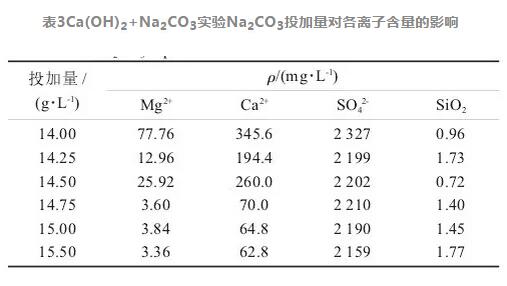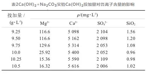Ca(OH)2和Na2CO3的對水樣中Ca2+、Mg2+、SiO2和SO42-的含量的影響如表2和表3所示。