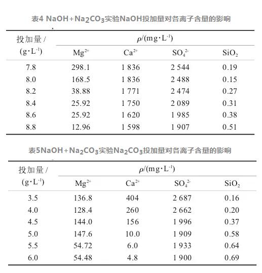 NaOH和Na2CO3的投加量對水中Ca2+、Mg2+、SiO2和SO42-的含量的影響分別如表4和表5所示。