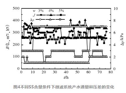 在循環(huán)料液SS的質(zhì)量分數(shù)分別為2%、3°%、4% 的條件下,系統(tǒng)的產(chǎn)水通量、過濾壓差、產(chǎn)水濁度及 其他指標變化趨勢如圖4、圖5和表7所示。