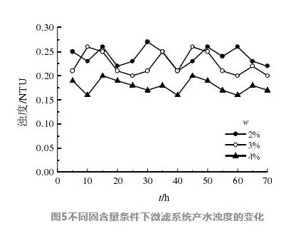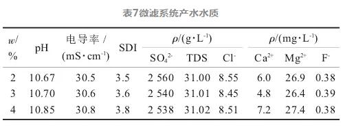 由圖5和表7可知,微濾系統(tǒng)產(chǎn)水濁度在0.16~0.3 NTU小幅波動,膜污染指數(shù)SDI小于3.8。隨著固含量的升高產(chǎn)水濁度略有降低、SDI略有上升。總體來看系統(tǒng)運行穩(wěn)定,而且SS的質(zhì)量分數(shù)為3%時的產(chǎn)水通量最大,產(chǎn)水量穩(wěn)定時間更長。