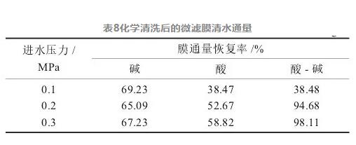 水中的顆粒、有機物以及膠體等物質(zhì)會在微濾膜表面發(fā)生架橋、吸附進而導致膜污堵,因此需要定期對膜進行清洗。周衛(wèi)青、李進等針對微濾膜的清洗進行了相關(guān)研究,確定酸堿聯(lián)合清洗效果最佳。據(jù)此,采用堿洗、酸洗、酸-堿聯(lián)合清洗3個清洗方案,通過恒定進水壓力條件下膜的產(chǎn)水通量的變化來表征膜過濾性能的變化。清洗實驗結(jié)果見表8;