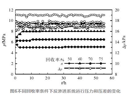 由圖6可知,系統(tǒng)運行壓力、壓差均隨著回收率的增大而增大,并且在各個回收率條件下運行時,壓力、壓差基本穩(wěn)定。當回收率為75%時,設(shè)備運行壓力超過了膜元件本身最高操作壓力( 8.3 MPa),影響膜的使用壽命。
