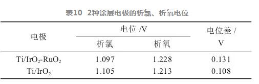 在電解制氯過程中,陽極上發(fā)生的析氧反應(yīng)是析氯反應(yīng)的主要競爭副反應(yīng),它不僅消耗電能,還降低制氯效率,因此陽極材料上發(fā)生的析氧反應(yīng)越小越有利于析氯反應(yīng)的進行。實驗對預(yù)選的2種涂層材料的陽極進行了析氯、析氧電位測定,結(jié)果如表10所示。