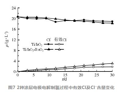 電解實驗在電流密度為100mA/cm2、平均水溫 為27.8 °C條件下進行,2種涂層電極電解制氯過程 中有效Cl及Cl-含量變化如圖7所示。