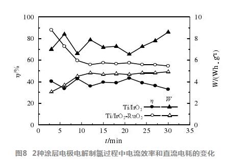 2種涂層電極電解制氯過程中電流效率n和直流電耗W的變化見圖8。