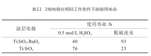 依據(jù)GB/T22839—2010,控制電解液溫度為40 °C 左右、電流密度為2A/cm2,分別以0.5 mol/L的 H2S〇4和減量濃縮后的脫硫廢水做電解液進行2組電極的陽極壽命實驗,以電解槽電壓升高至5 V所 累計的電解時間作為陽極的強化壽命實驗失效時間,結(jié)果如表11所示。