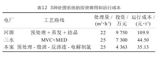 河源某電廠是國內(nèi)第1家真正意義上實現(xiàn)廢水零排放的電廠,采用了 “預(yù)處理+蒸發(fā)+結(jié)晶”工 藝,三水某電廠采用“預(yù)處理+臥式MVC濃縮+臥式MED結(jié)晶”工藝,他們與本研宄的“預(yù)處理-微濾-反滲透-電解制氯”投資及運行成本的比較見表12。