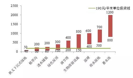 2015年10月9日在國務(wù)院例行政策吹風(fēng)會上,住建部已選擇16個城市開展“海綿城市”建設(shè)試點,計劃3年內(nèi)投資865億元,建設(shè)面積450多平方公里,按此計算,每平方公里投資約1.9億元(折合190元/平米),而實踐中大部分海綿城市相關(guān)的低影響開發(fā)單項設(shè)施投資均在190元/平米之上(圖1)。