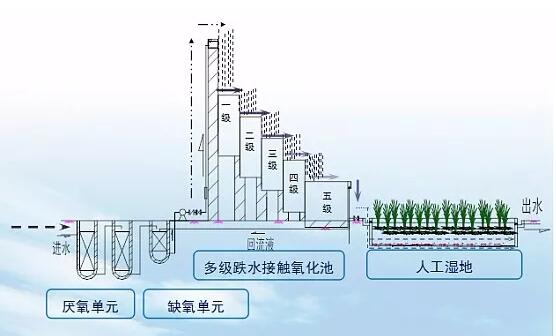 生物生態(tài)組合工藝由厭氧單元、缺氧單元、多級跌水接觸氧化池、人工濕地四部分構(gòu)成。