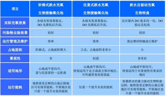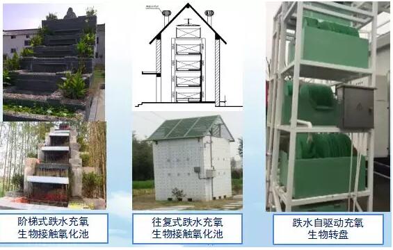 好氧單元包含多種跌水曝氣充氧裝置、脈沖多層復合濾料生物濾池、自驅(qū)動生物轉(zhuǎn)盤等。工藝通過跌水、拔風、自然通風等自然充氧形式,取代傳統(tǒng)大型污水處理廠高能耗的機械、鼓風曝氣技術,有效減低能耗,且具有景觀效應。