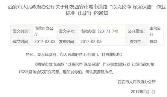 2017年2月8日,西安市政府辦公廳發(fā)布《西安市城市道路“以克論凈 深度保潔”作業(yè)標(biāo)準(zhǔn)(試行)》(下稱《標(biāo)準(zhǔn)》),對(duì)城市道路清掃保潔作業(yè)標(biāo)準(zhǔn)進(jìn)行了明確規(guī)定。該《標(biāo)準(zhǔn)》將西安市道路清掃保潔等級(jí)劃分為重點(diǎn)區(qū)域、一級(jí)、二級(jí)、三級(jí)道路,并要求每平方米灰塵分別不超過5克、10克、15克和20克。