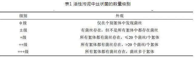 據(jù)統(tǒng)計,在發(fā)生污泥膨脹的活性污泥法處理廠中,約有90%的污泥膨脹問題是由于活性污泥中絲狀菌過量生長引起的。Sezgin等將絲狀菌膨脹定義為“宏觀結(jié)構(gòu)的失敗,從某種意義上來說,有太大的宏觀結(jié)構(gòu)”,即絲狀菌是構(gòu)成活性污泥絮體的骨架,能夠保持污泥良好的絮體結(jié)構(gòu),但是當(dāng)絲狀菌數(shù)量太多時,就會影響污泥的沉降性能和壓縮性能。關(guān)于污泥膨脹嚴(yán)重程度的判定指標(biāo)主要有以下幾個:(1)由絲狀菌引起的污泥膨脹,絲狀菌總長大于104 m/L;(2)根據(jù)活性污泥中絲狀菌數(shù)量的多少進(jìn)行分級(如表1所示);(3)污泥體積指數(shù)(SVI)大于150 mL/g。