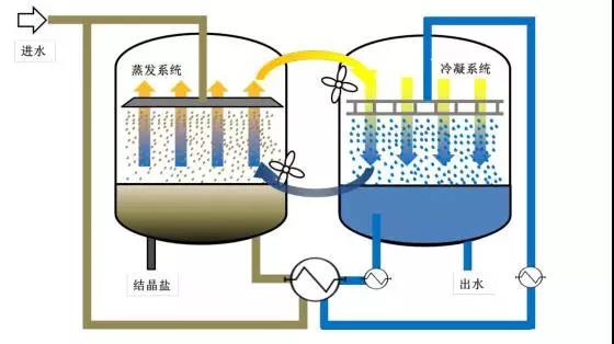 廢水首先經(jīng)過換熱器被加熱至一定溫度(40~80oC),然后進(jìn)入蒸發(fā)系統(tǒng),水分蒸發(fā)形成水蒸汽,在循環(huán)風(fēng)的作用下被移至冷凝系統(tǒng),含有飽和水蒸氣的熱空氣與冷凝系統(tǒng)內(nèi)的冷水(20~50oC)相遇而凝結(jié)成水滴,并被輸送至系統(tǒng)外。經(jīng)蒸發(fā)后的廢水濃度不斷升高,達(dá)到飽和溶解度的鹽從溶液中析出形成固體顆粒,并最終從水中分離出去。
