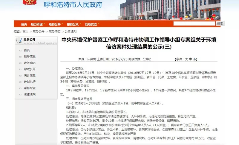 在呼和浩特市人民政府網(wǎng)站的政務(wù)公開一欄中,督察人員查閱到標(biāo)題為《中央環(huán)境保護(hù)督察工作呼和浩特市協(xié)調(diào)工作領(lǐng)導(dǎo)小組專案組關(guān)于環(huán)境信訪案件處理結(jié)果的公示(三)》的網(wǎng)頁(yè),其中清楚地顯示對(duì)凱帝森木門加工廠的問(wèn)責(zé)及處罰情況?!皠P帝森木門加工廠企業(yè)無(wú)環(huán)評(píng)手續(xù),無(wú)任何環(huán)保治理設(shè)施,產(chǎn)生的油漆味、粉塵、噪音環(huán)境污染嚴(yán)重”。處理結(jié)果是“對(duì)凱帝森木門加工廠實(shí)施行政處罰10萬(wàn)元,對(duì)企業(yè)予以取締,責(zé)令拆除生產(chǎn)設(shè)備”。