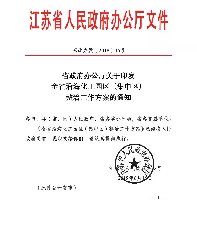 日前,江蘇省辦公廳印發(fā)了《全省沿?;@區(qū)(集中區(qū))整治工作方案的通知》(蘇政辦發(fā)【2018】46號(hào),下稱46號(hào)文),文件要求對(duì)沿海地區(qū)南通、連云港、鹽城三市轄區(qū)內(nèi)所有化工園區(qū)及園區(qū)內(nèi)所有化工生產(chǎn)企業(yè)進(jìn)行整治。另有消息稱,江蘇省環(huán)保廳也下發(fā)了復(fù)產(chǎn)通知,對(duì)園區(qū)和企業(yè)環(huán)保達(dá)標(biāo)做出具體規(guī)定。