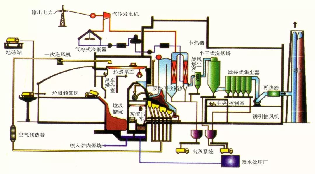 生活垃圾焚燒發(fā)電廠包括主體工藝系統(tǒng)、輔助系統(tǒng)和配套設(shè)施三大部分。