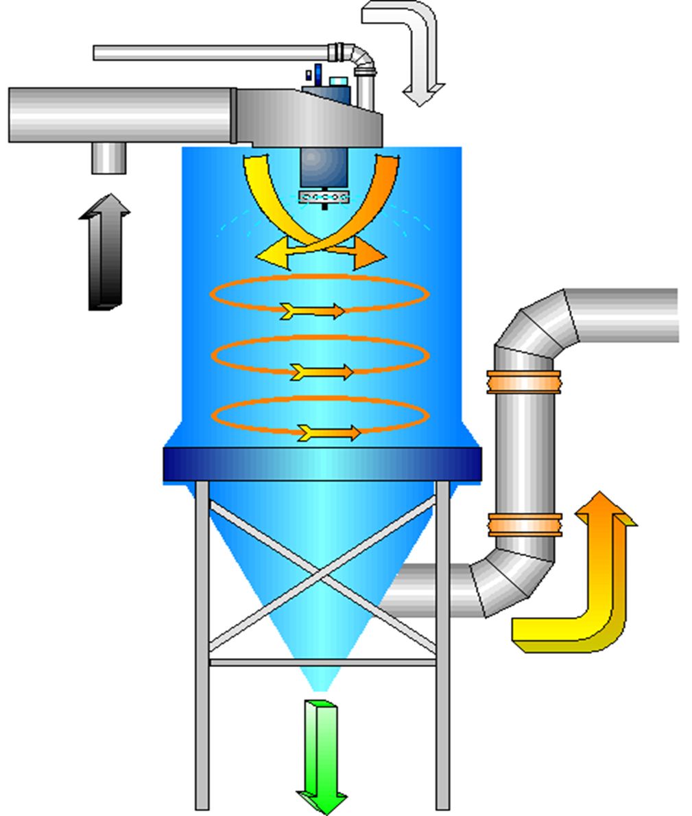 鍋爐出口溫度為210℃的煙氣自頂部導(dǎo)入噴霧塔,噴霧塔頂部導(dǎo)流片使煙氣進入噴霧塔后形成旋轉(zhuǎn)紊流流動,噴霧塔的頂部布置石灰漿液噴霧機,將石灰漿液粉碎成直徑為50微米以下的霧滴,以大大提高石灰漿液的比表面積和增加煙氣中酸性氣體分子與石灰漿液中氫氧化鈣分子接觸的面積和接觸的時間,以確保較高的反應(yīng)效率,酸性氣體與石灰漿液的反應(yīng)后生成粉塵顆粒,當(dāng)煙氣從噴霧塔導(dǎo)出時隨著流向的改變,在離心力的作用下,有較多的粉塵脫離煙氣掉入灰斗。
