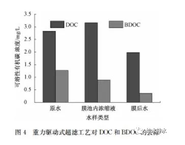 在水中污染物質(zhì)的去除方面,重力驅(qū)動式超濾工藝可以有效控制膜后水中濁度和微生物指標(biāo),對UV254和CODMn的總體去除率分別在16.3%~30%和6.9%~27%。另一方面,重力驅(qū)動式超濾工藝對于有機(jī)物質(zhì)具有一定的去除效果,尤其是對BDOC的去除效果較好,這是由于膜池和濾餅層上的微生物消耗原水中BDOC造成的。此外,采用微絮凝+重力驅(qū)動式超濾工藝,可有效提升出水水質(zhì)。