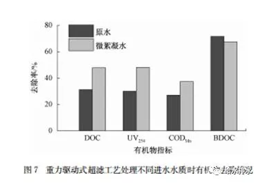 低壓重力驅(qū)動式超濾工藝運(yùn)行30 d后,改變進(jìn)水水質(zhì),即向原水中投加2 mg/L的聚氯化鋁(PAC),經(jīng)過快速混合通入超濾膜池中。重力驅(qū)動式超濾工藝處理經(jīng)過微絮凝的原水依然可以保證穩(wěn)定通量,工藝運(yùn)行3 d后,監(jiān)測重力驅(qū)動式超濾工藝處理微絮凝水的凈水效能。微絮凝原水條件下,工藝對濁度和微生物指標(biāo)的控制效果較好,出水濁度控制在0.1 NTU以內(nèi),菌落總數(shù)指標(biāo)均控制在2 CFU/mL以內(nèi)。此外,如圖7所示,比較了2種進(jìn)水水質(zhì)條件下,超濾工藝對有機(jī)物的去除情況??梢钥闯?,經(jīng)過微絮凝水處理后,超濾工藝對DOC、UV254和CODMn的去除效果均有所提升,去除率分別提升了16.6%、18.2%和10.6%。這說明原水經(jīng)過微絮凝處理協(xié)同重力驅(qū)動式超濾工藝對于改善出水水質(zhì)有很好的促進(jìn)作用。