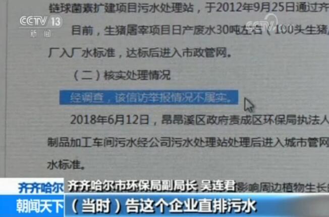 齊齊哈爾市環(huán)保局副局長吳連君:當(dāng)時(shí)告“這個(gè)企業(yè)直排污水,水呈黑色且有異味,影響周邊植物生長”,他?回答的是:認(rèn)為企業(yè)有污水治理設(shè)施,處理完了進(jìn)入城市管網(wǎng)排放,就根據(jù)這個(gè),來定的是群眾舉報(bào)不屬實(shí)。