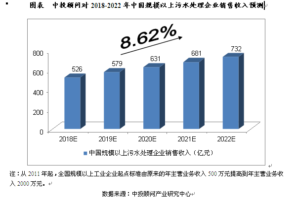 2016年,我國規(guī)模以上污水處理企業(yè)銷售收入達(dá)到了442.78億元,相比上年增長4.52%。我們預(yù)計(jì),2018年我國規(guī)模以上污水處理企業(yè)銷售收入將達(dá)到526億元,未來五年(2018-2022)年均復(fù)合增長率約為8.62%,2022年將達(dá)到732億元。