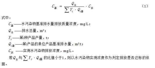 4.2.4水污染物排放濃度限值適用于單位產(chǎn)品實際排水量不高于單位產(chǎn)品基準排水量的情況。若單位產(chǎn)品實際排水量超過單位產(chǎn)品基準排水量,應按式(1)將實測水污染物濃度換算為水污染物基準排水量排放濃度,并以水污染物基準排水量排放濃度作為判定排放是否達標的依據(jù)。產(chǎn)品產(chǎn)量和排水量統(tǒng)計周期為一個工作日。